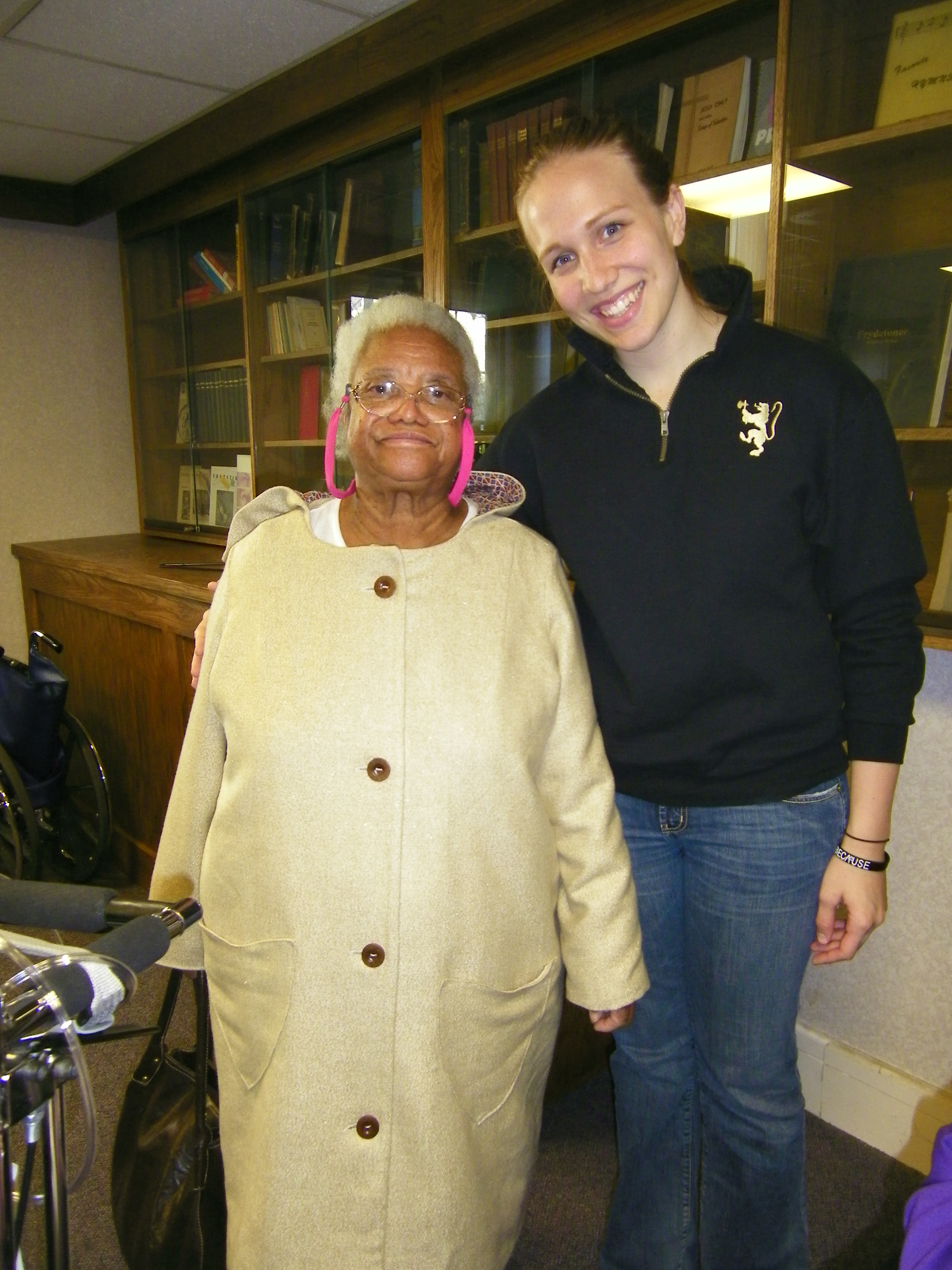 My design class and I had the opportunity to create clothing for seniors at the Ebenezer Home who expressed need. I was so fortunate to work with a lovely lady named Maxine, who had Alzheimers, and who needed a coat for the cold weather. She picked out all of the aspects she desired, and I created it for her. She loved the beige wool tweed with little flecks of gold, the long length, the large hood, large buttons, fun pockets, the simple cut, and the colorful lining. The buttons and interlining were recycled, and the lining was a vintage fabric sitting in storage. She was so sweet, and overwhelmingly excited– I teared up seeing how thankful she was. It was a wonderful experience.